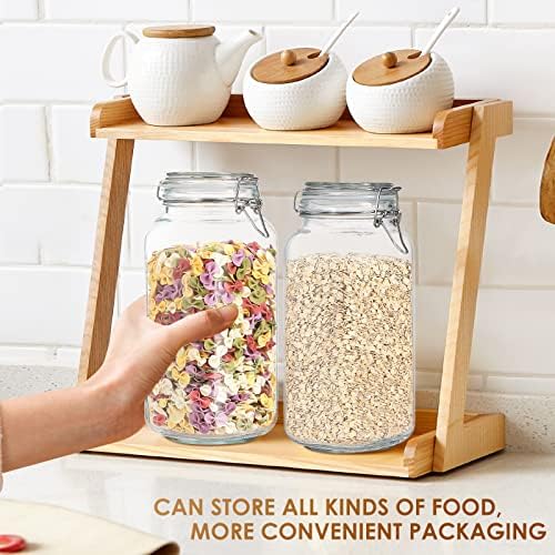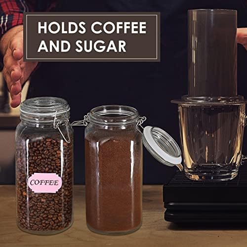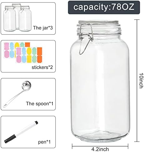 【Perfect Food Storage Set】 This glass canister set comes with 3 jars with a big spoon, 78 oz capacity, 4.2 x 10 inches. Prefect size to be used as storage jars for pantry and kitchen storage. Ideal for storing pasta, flour, sugar, cereal, coffee, beans, candy, cookies, snacks. 【Airtight Seal Glass Lids】The glass jars have matching sealing covers, which will not allow gas to enter and spoil the food. It has super sealing performance and is a good helper in your kitchen. 【Large Capacity & Large Opening】 The 78oz jars can be used to store cereals, pasta, dry food, etc. They can also be used to store homemade pickles and fire pickles. These large airtight jars have large opening for easy access to food, and the transparent glass jars allow you to quickly find what you want. 【Come with Convenient Accessories】You will get three 78oz sealed cans, two pieces coloured labels and a pen for keeping track of stored food and storage time, as well as a spoon for storing or removing food. 【Satisfaction】 Our customers are the world, our products must satisfy customers, if you have any dissatisfaction, please ask customer service, we will solve it patiently.
